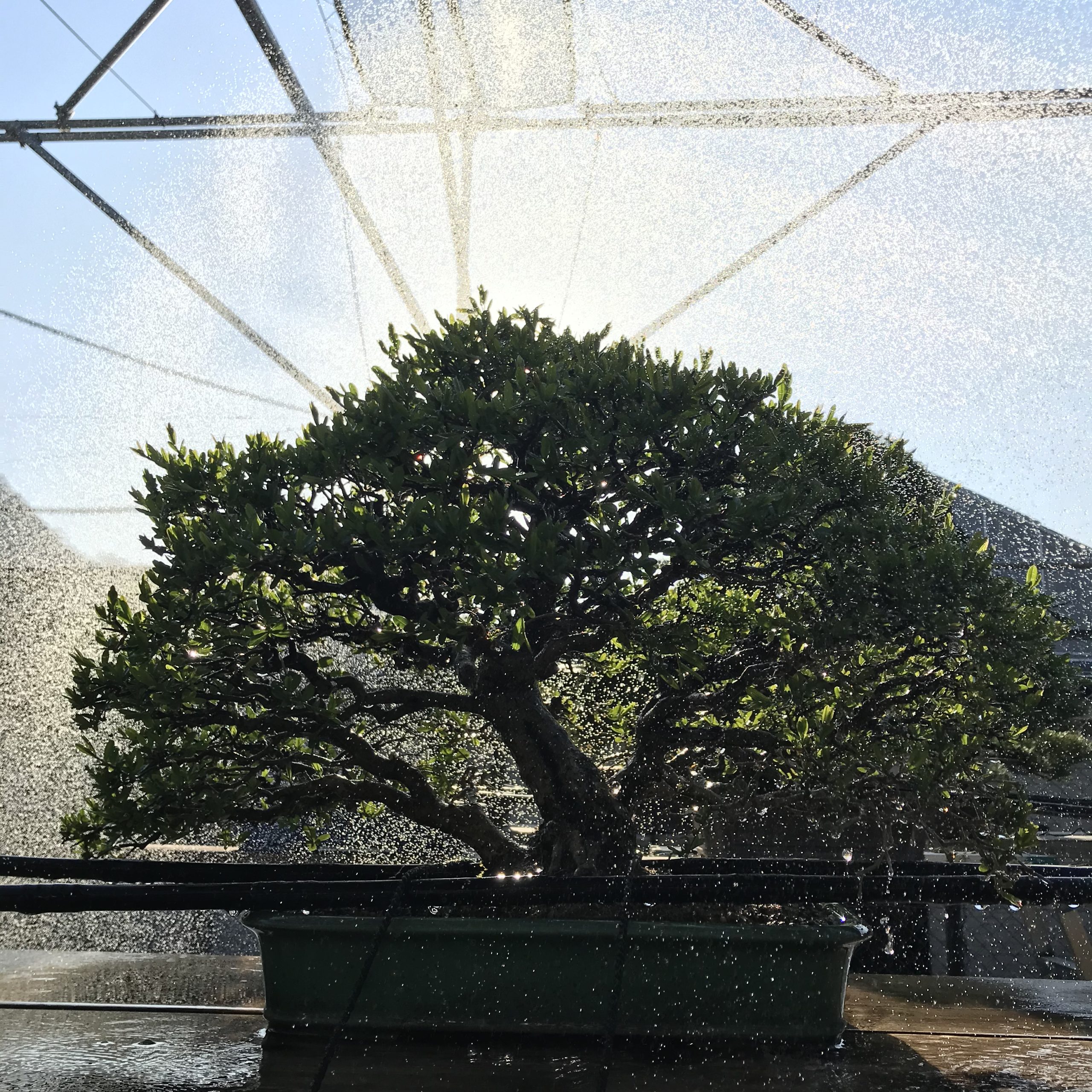 本当は決まった時間、決まった量、機械による自動灌水などでやるのではなく、人の手で盆栽一つ一つの状態を見て、量や頻度を調整してやるのが良いのですが、沢山盆栽を所蔵している盆栽園などではなかなか難しいです。他の作業(剪定、植え替えなど)が立て込む時などはどうしても自動灌水に頼ってしまいます。
